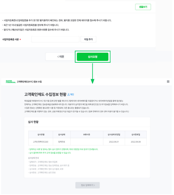 가입하신 사업자번호로 고객확인제도 정보 입력이 필요한 경우 가입심사완료 후 네이버페이센터(예약형은 스마트플레이스)에 접속하시면 <고객확인제도 정보 입력 안내> 팝업이 노출됩니다.
