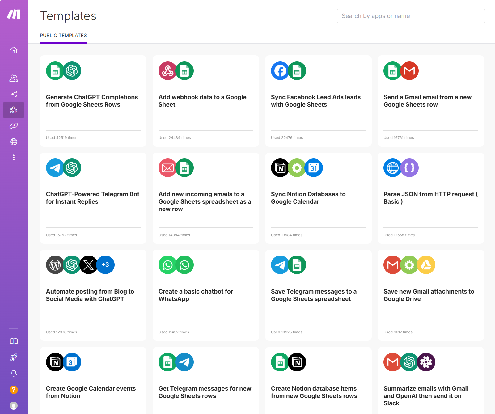 Template 란에 가면 위와 같이 조금 구체화시켜서 해볼 수 있는 템플릿들이 있습니다. Incoming Emails를 구글시트의 신규열로 자동 추가하는 부분은 정말 편리하겠네요. 그래도 제가 제일 관심있는 부분은 챗지피티로 블로그, SNS에 자동포스팅하는 부분입니다.