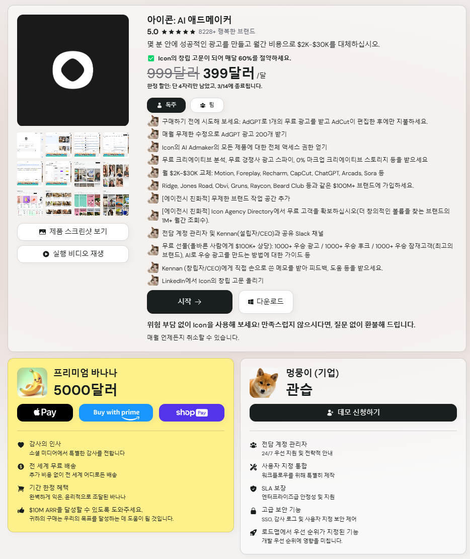 마치 ChatGPT와 CapCut을 합쳐놓은 듯한 Icon은, 아이디어만 있으면 AI가 자동으로 광고 스크립트를 작성하고, 기존 영상 라이브러리에서 최적의 클립을 찾아 편집하여 광고를 완성하는 기능이 있다고 소개되어 있습니다.