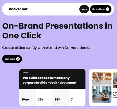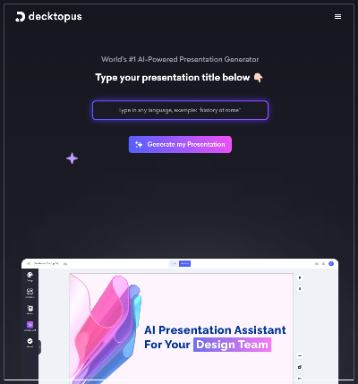 세계 최고의 AI 기반 프레젠테이션 생성기로 평가받는 도구입니다. - 특징: 테마, 레이아웃, 콘텐츠 추천까지 모두 자동화. - 사용 방법: 주제를 입력하면 즉시 완성된 프레젠테이션을 제공합니다. - 웹사이트: https://decktopus.com