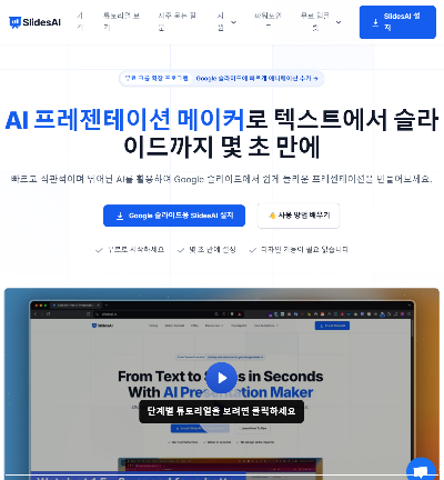Google Slides의 확장 프로그램으로, 텍스트를 기반으로 슬라이드를 제작합니다. - 특징: Google Slides와 완벽히 통합되어 추가 설치가 간단함. - 사용 방법: Google Slides에서 Slides AI 확장을 설치하고 텍스트를 입력하세요. - 웹사이트: https://slidesai.io
