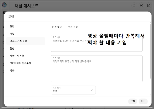 영상 올릴 때마다 반복해서 올려야 하는 채널 설명, 연락처 등이 있다면 대시보드 설정에서 기입해두면 훨씬 편리합니다.
