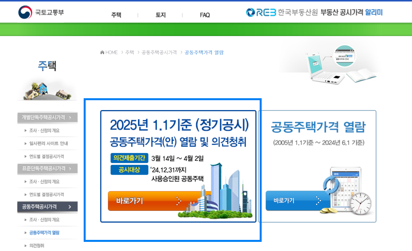 우측의 공동주택가격 열람 말고 좌측 정기공시란으로 확인해보셔야 합니다.