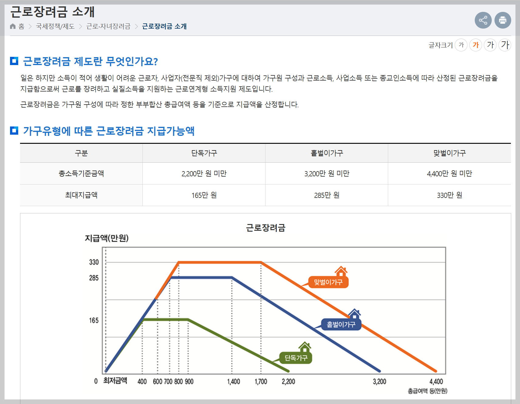 쉽게 말해, 열심히 일하지만 소득이 적어 생활이 어려운 분들에게 정부가 현금을 지원해 주는 것이죠!