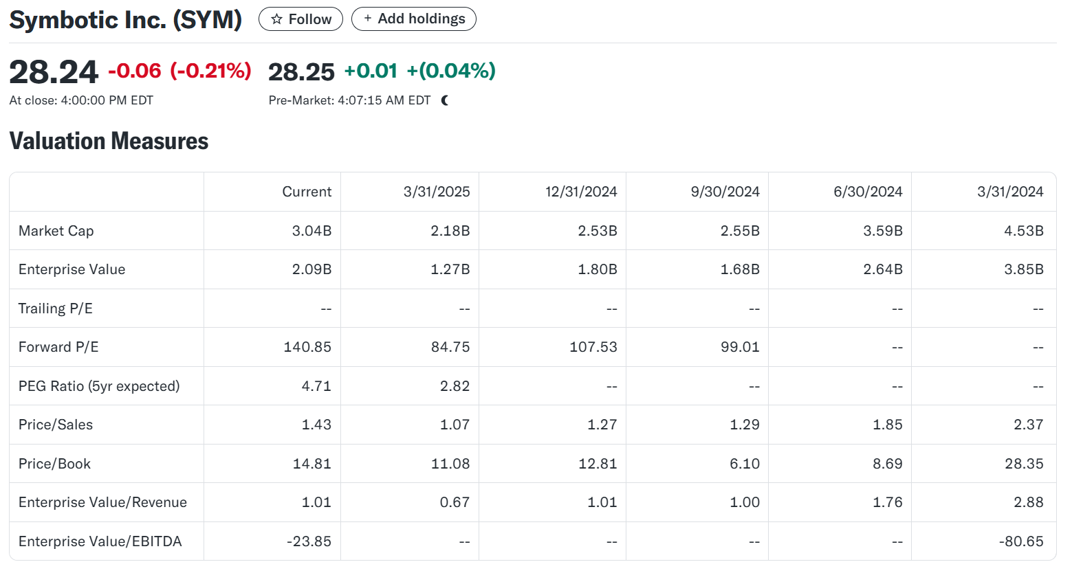 2025년 5월 기준, 심보틱(NASDAQ: SYM) 주가는 월마트 등 대형 파트너십, AI 자동화 시장 성장 기대감에 힘입어 강세를 보이고 있습니다.