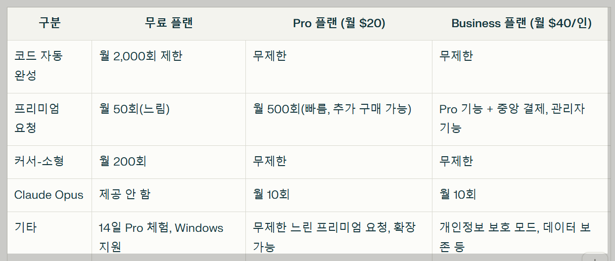 무료 플랜은 소규모 프로젝트나 학습용으로 충분하지만, 대규모 개발이나 협업, 무제한 AI 기능이 필요하다면 유료 플랜(Pro, Business)을 권장합니다.