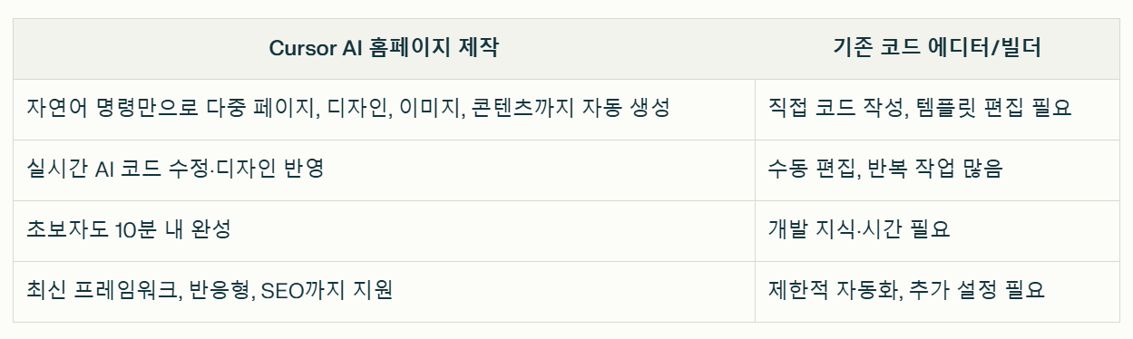Cursor AI는 단순한 코드 자동화 도구를 넘어, 누구나 쉽고 빠르게 고품질 홈페이지를 만들 수 있는 AI 기반 웹사이트 제작 플랫폼입니다.