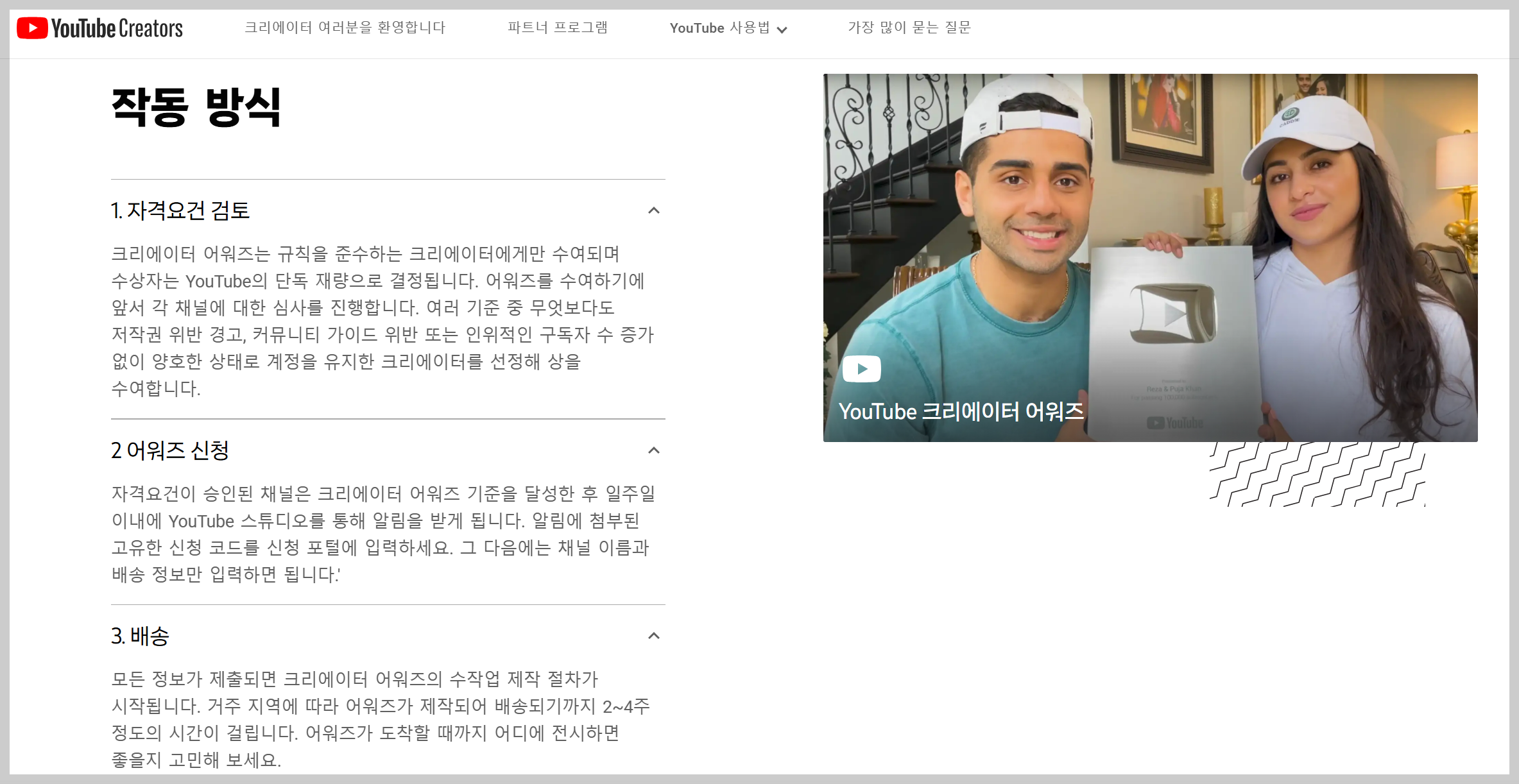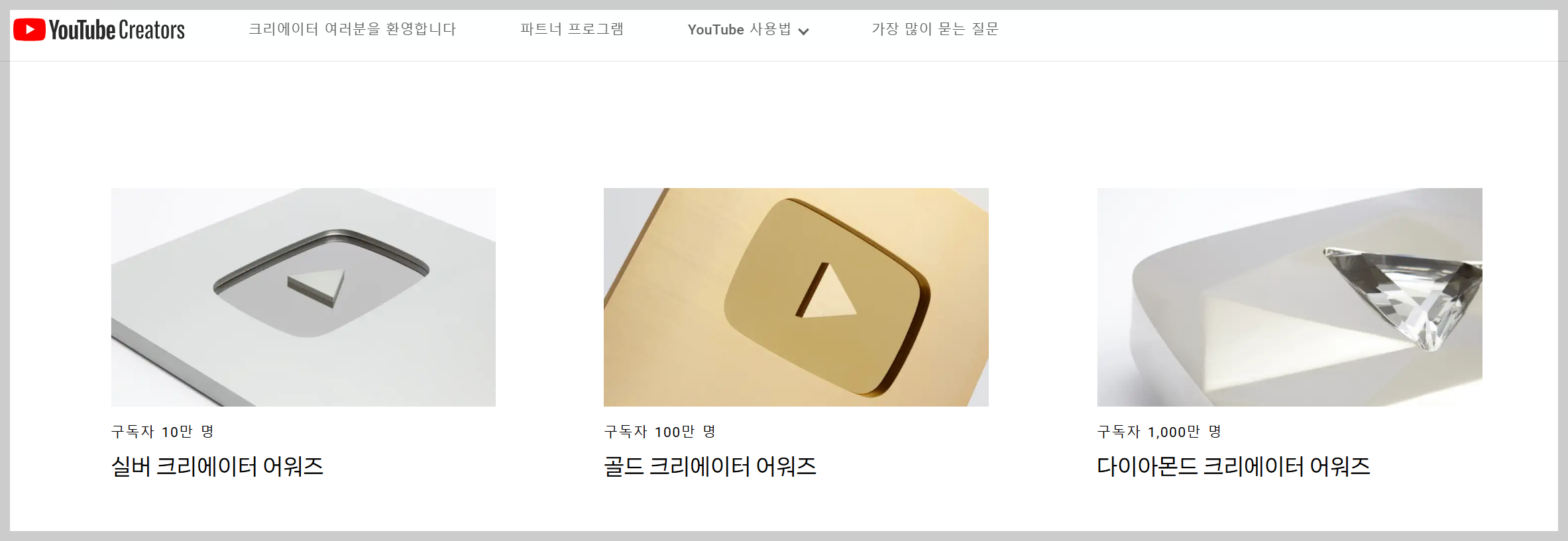 유튜브는 특정 구독자 수를 달성한 채널에게 크리에이터 어워즈라는 이름으로 플레이 버튼을 수여합니다.