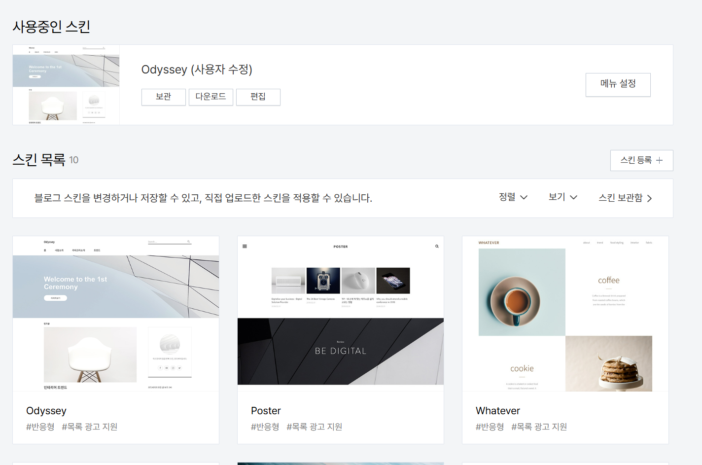 특히 Odyssey 스킨은 HTML 구조가 단순해 메타 설명을 직접 추가하기 쉬워 SEO 최적화에 유리합니다.