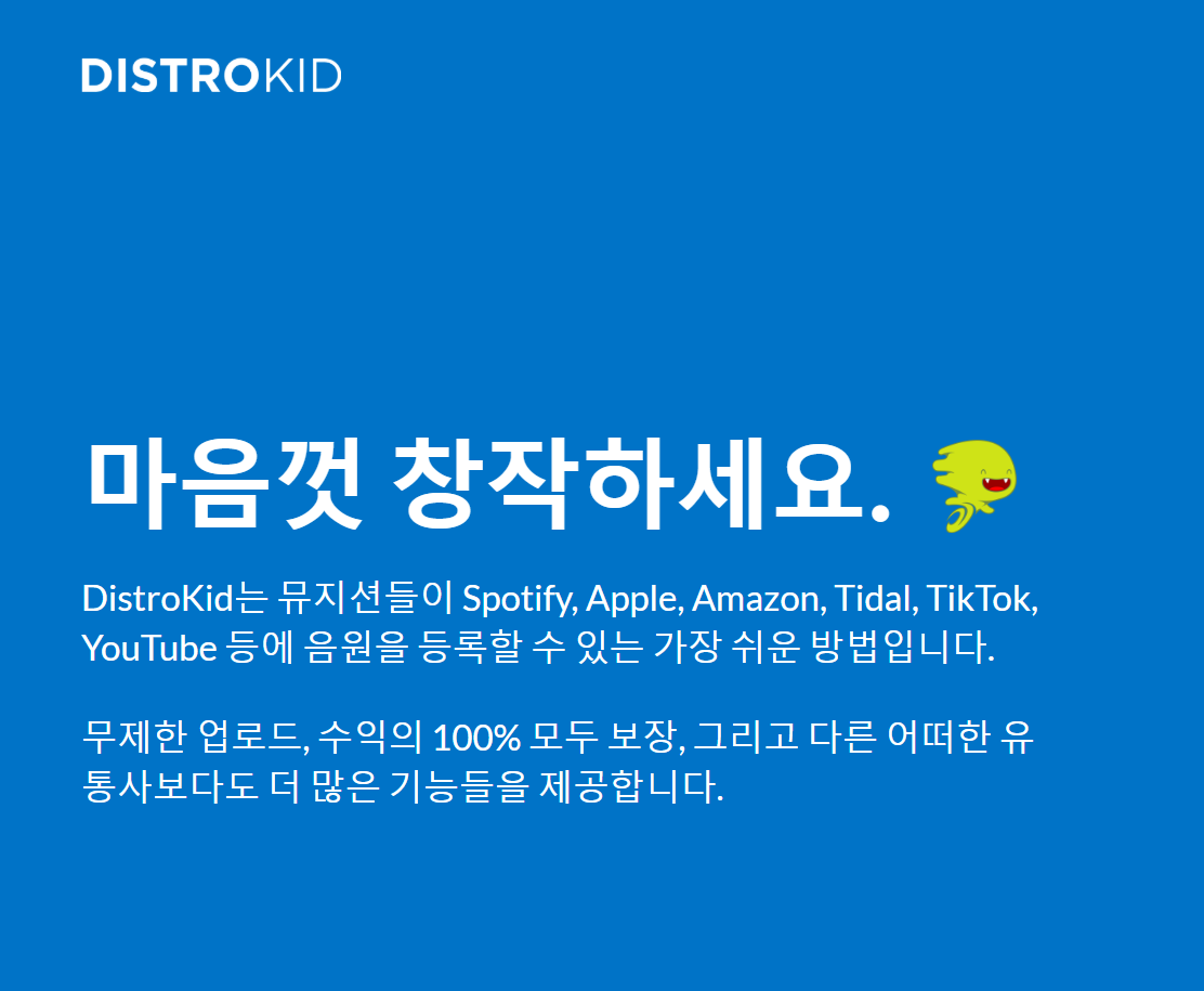 | 주요 음원 유통사 | 디스트로키드(DistroKid) | 연간 구독료 방식, 무제한 업로드 가능 |