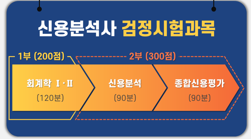 신용분석사 시험은 1부와 2부로 나뉘어 총 500점 만점으로 구성됩니다.
