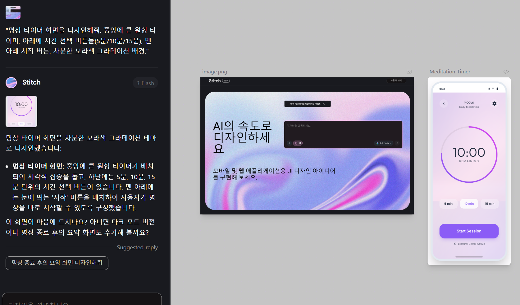저는 시험삼아 명상앱 디자인을 위한 프롬프트를 입력해보았습니다.