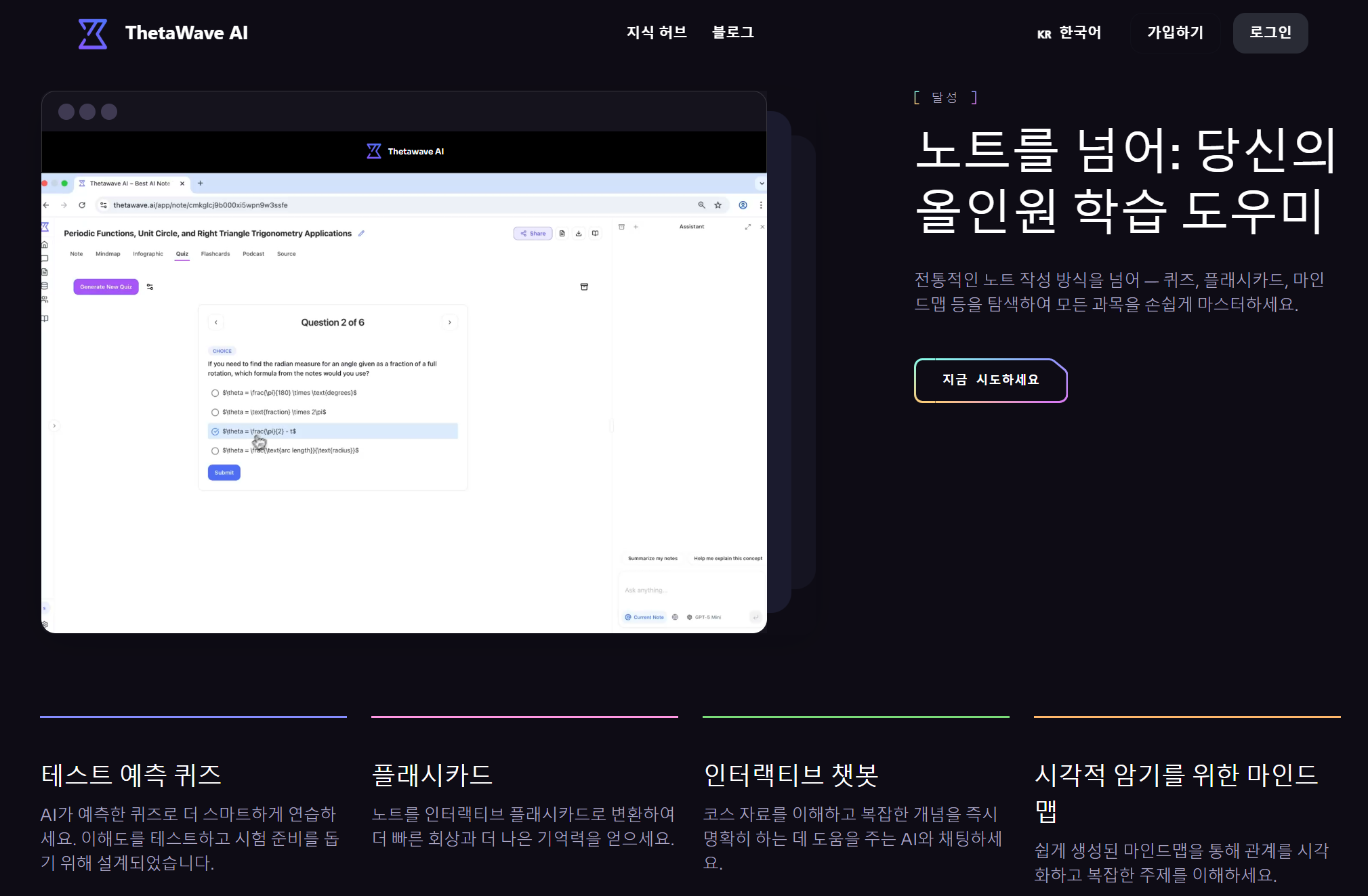 - ThetaWave: 실시간 전사(Transcribe), 마인드맵 생성, 플래시카드 및 퀴즈 생성 등 '학습 최적화' 기능에 특화.