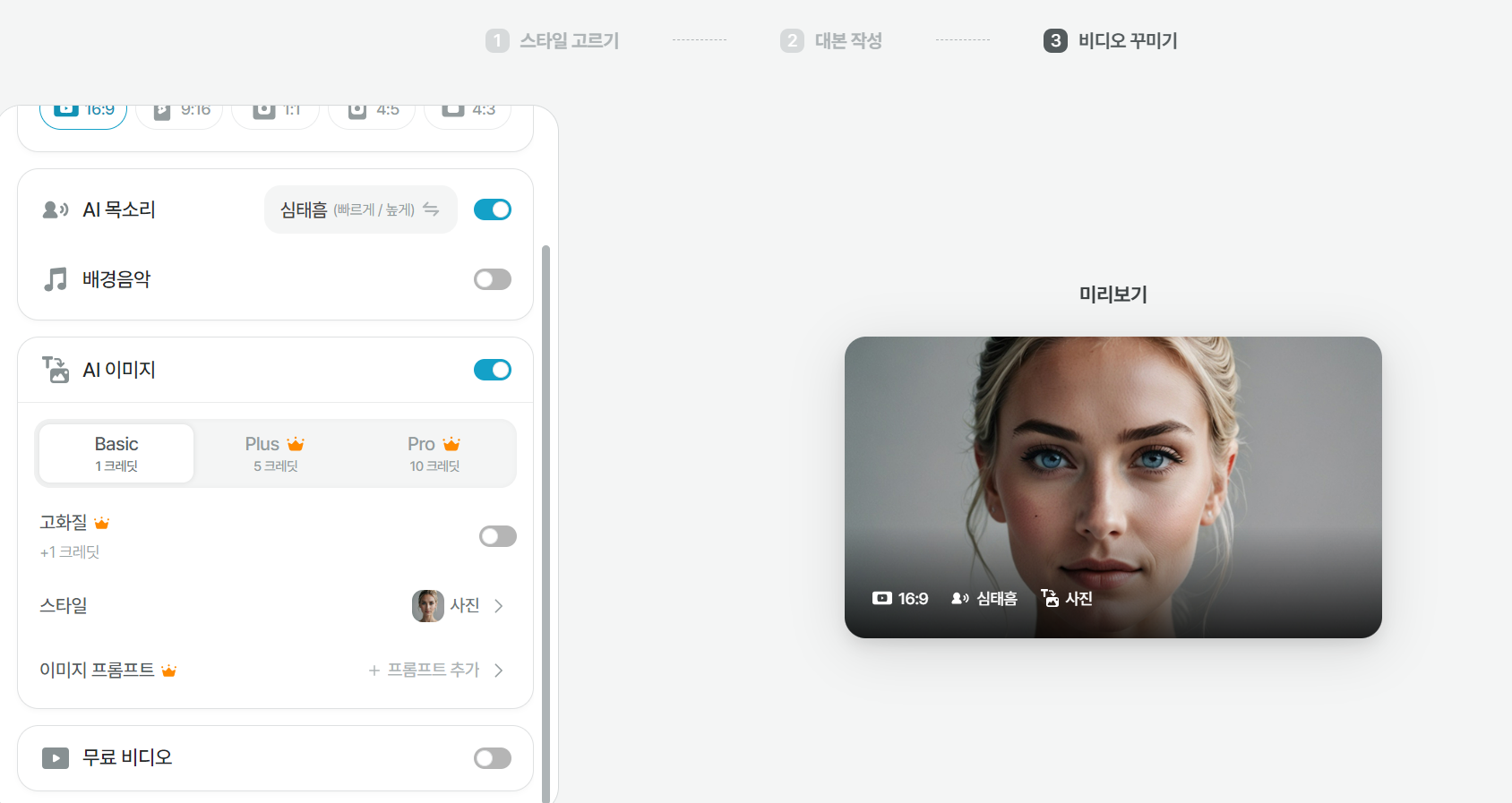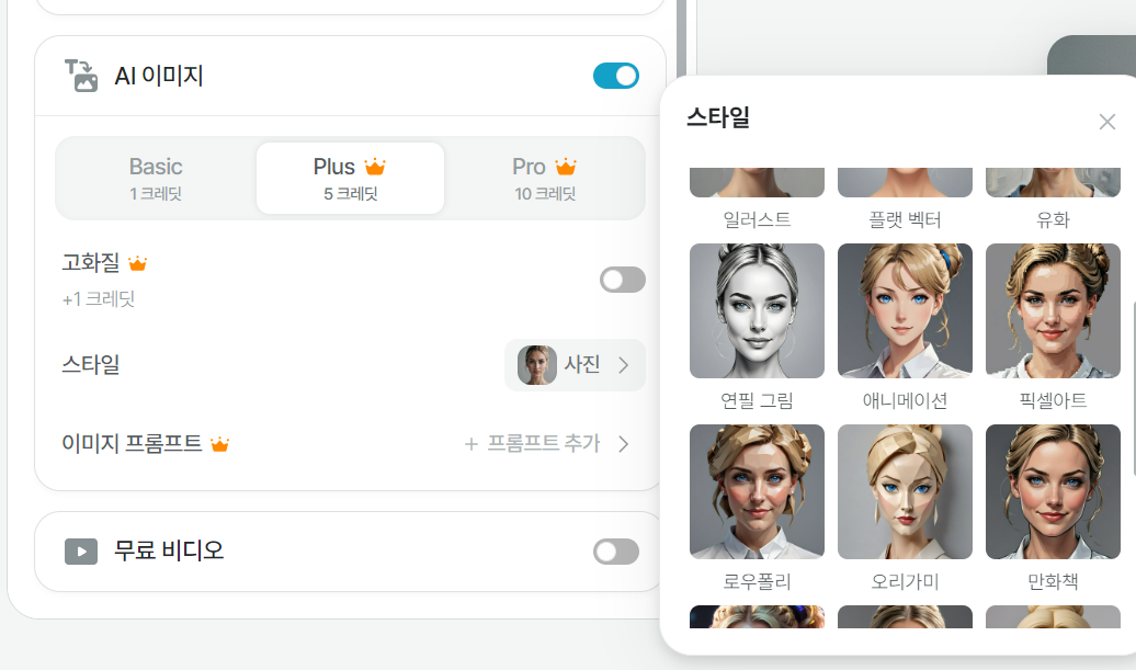 - 모델 선택 가능: 비디오 역시 Basic(10크레딧)과 Pro(50크레딧) 모델 중 선택하여 생성할 수 있습니다.