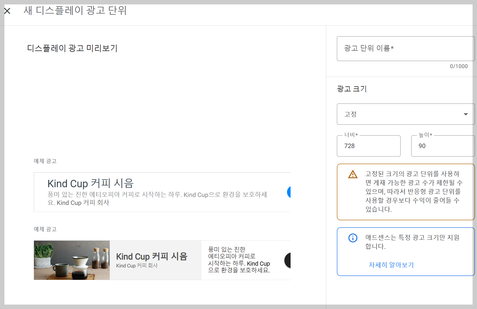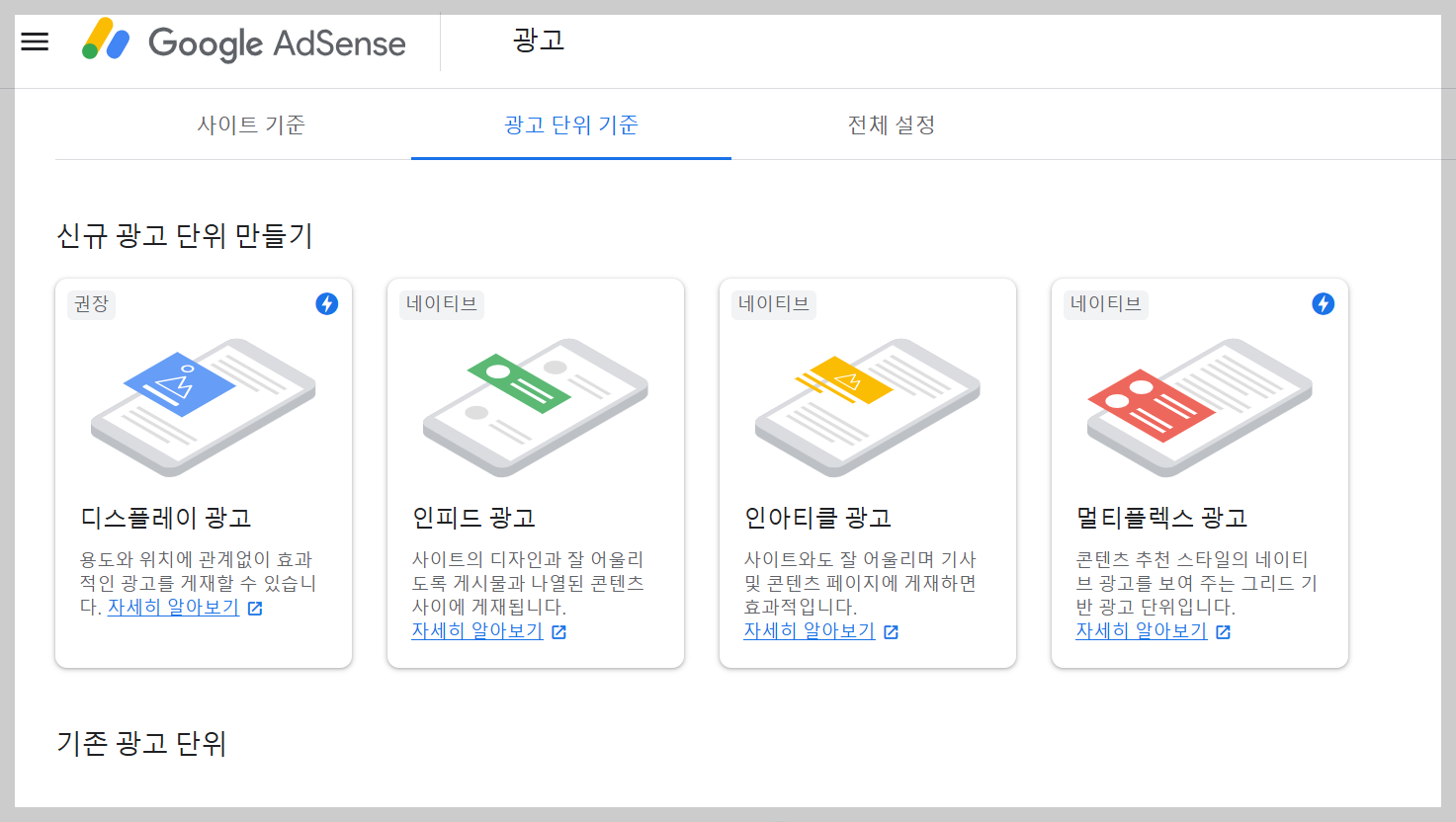 구글 애드센스 - 광고 탭을 누르면 '광고 단위 기준' 란에 위와 같이