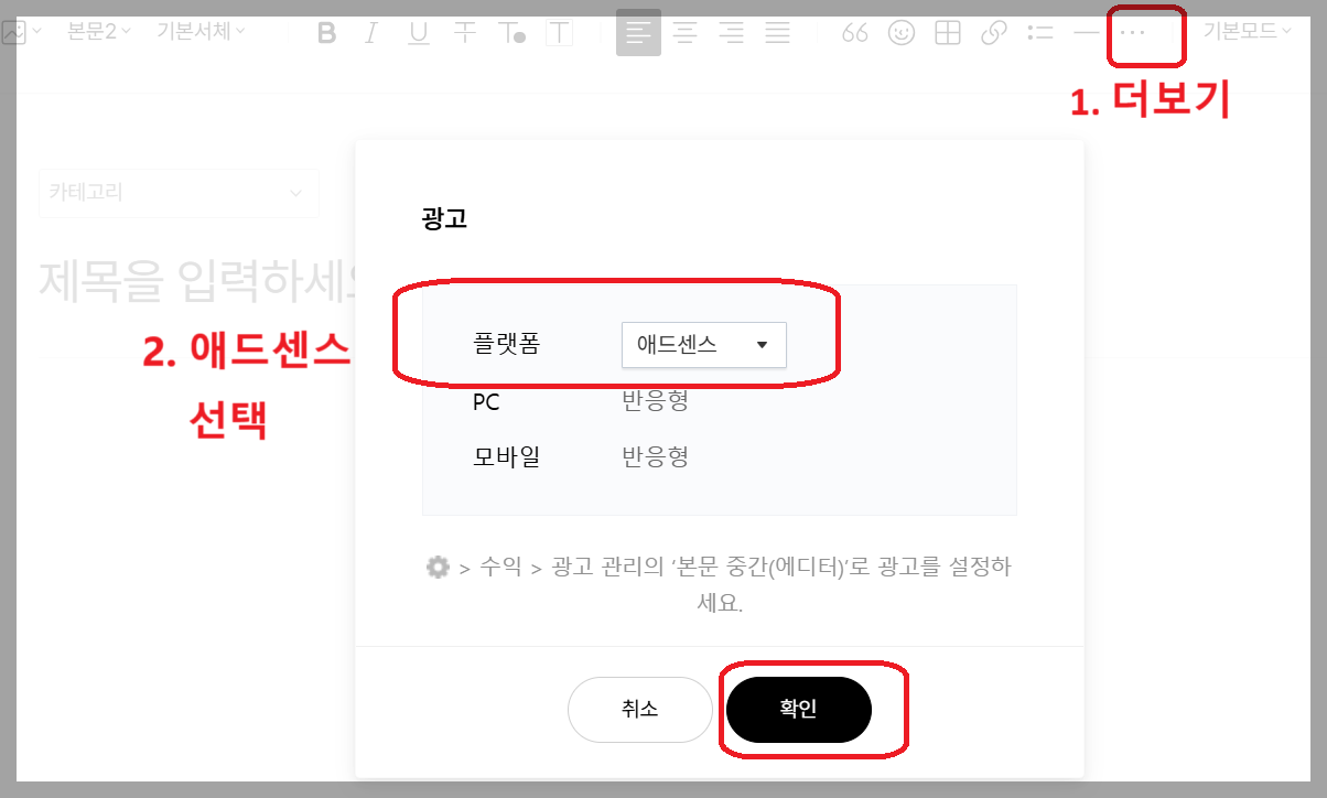 글쓰기 란(에디터)를 연 다음, 점세개 (더보기 란) 클릭 후 광고를 선택해줍니다.
