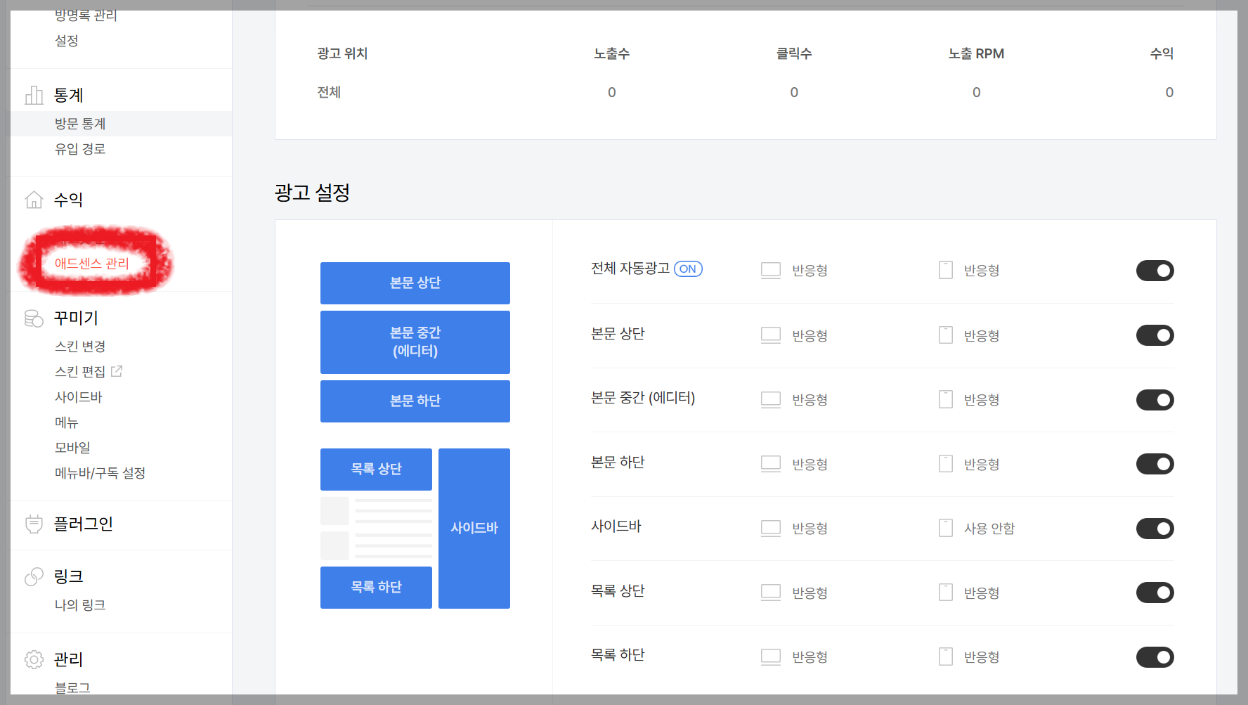 [블로그관리] - [수익] - 애드센스 관리에서 광고설정을 활성화할 것!!!