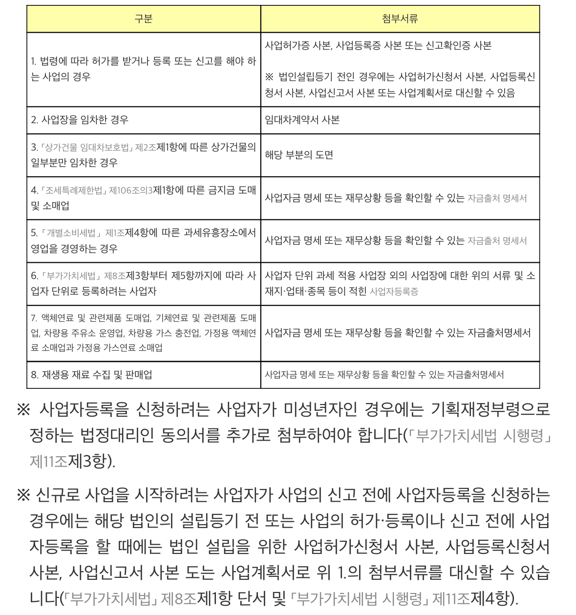 사업자는 사업장마다 다음의 서류를 사업개시일부터 20일 이내에 사업장 관할 세무서장에게 제출하여 사업자등록을 신청해야 합니다.