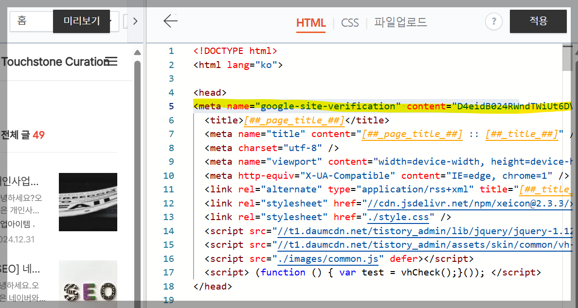 티스토리 관리 페이지 → 플러그인 설정 → HTML HEAD 편집에 메타 태그를 붙여넣습니다.