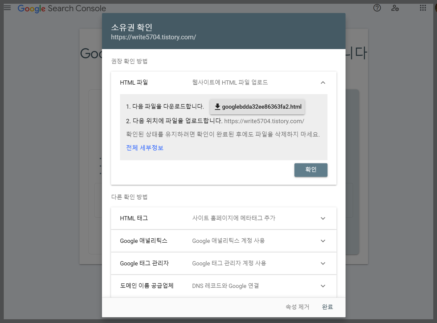 DNS 레코드를 추가하여 소유권을 확인하거나, 메타 태그 방식도 동일하게 사용할 수 있습니다.