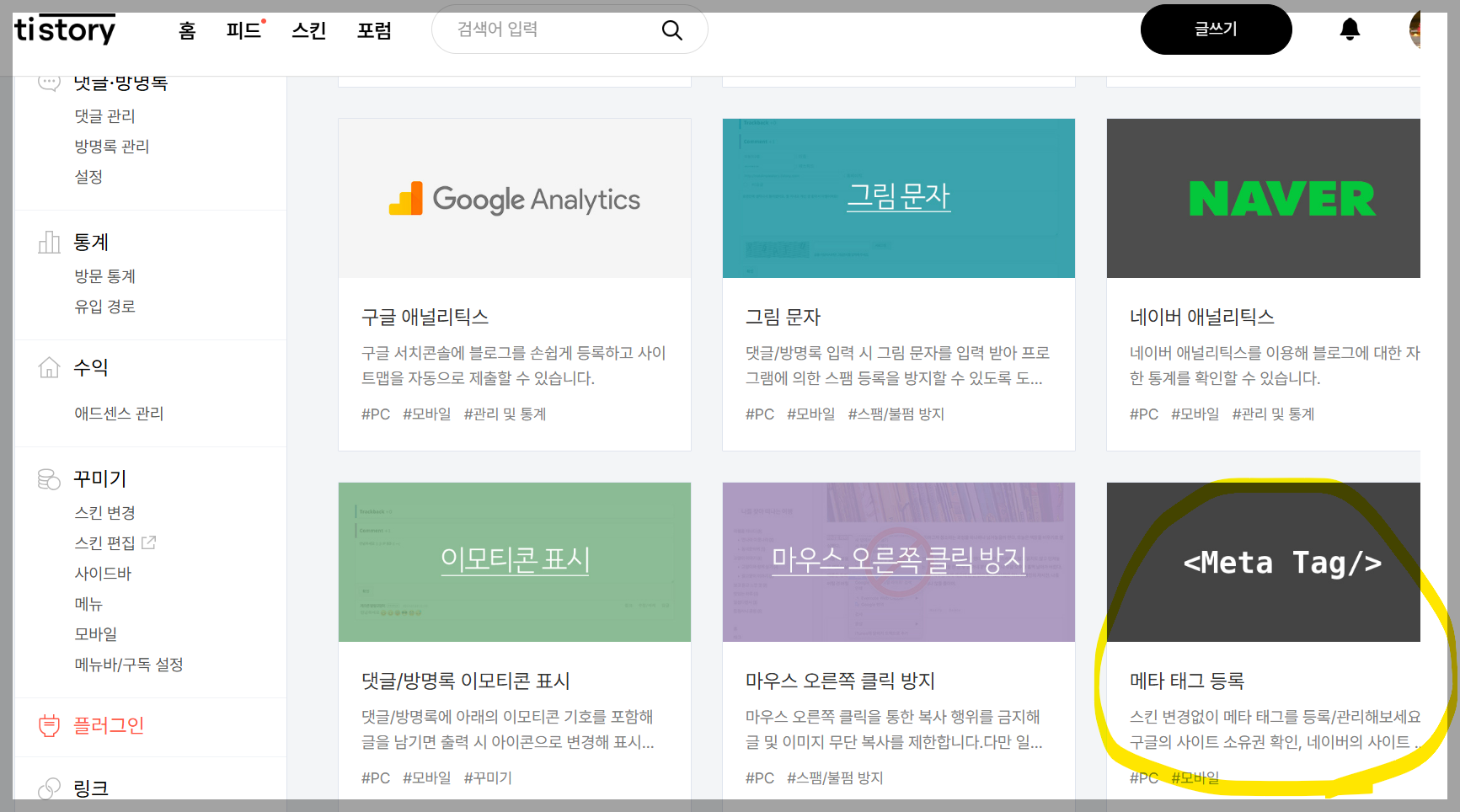 티스토리에도 플러그인 중 메타태그 등록이 있습니다.