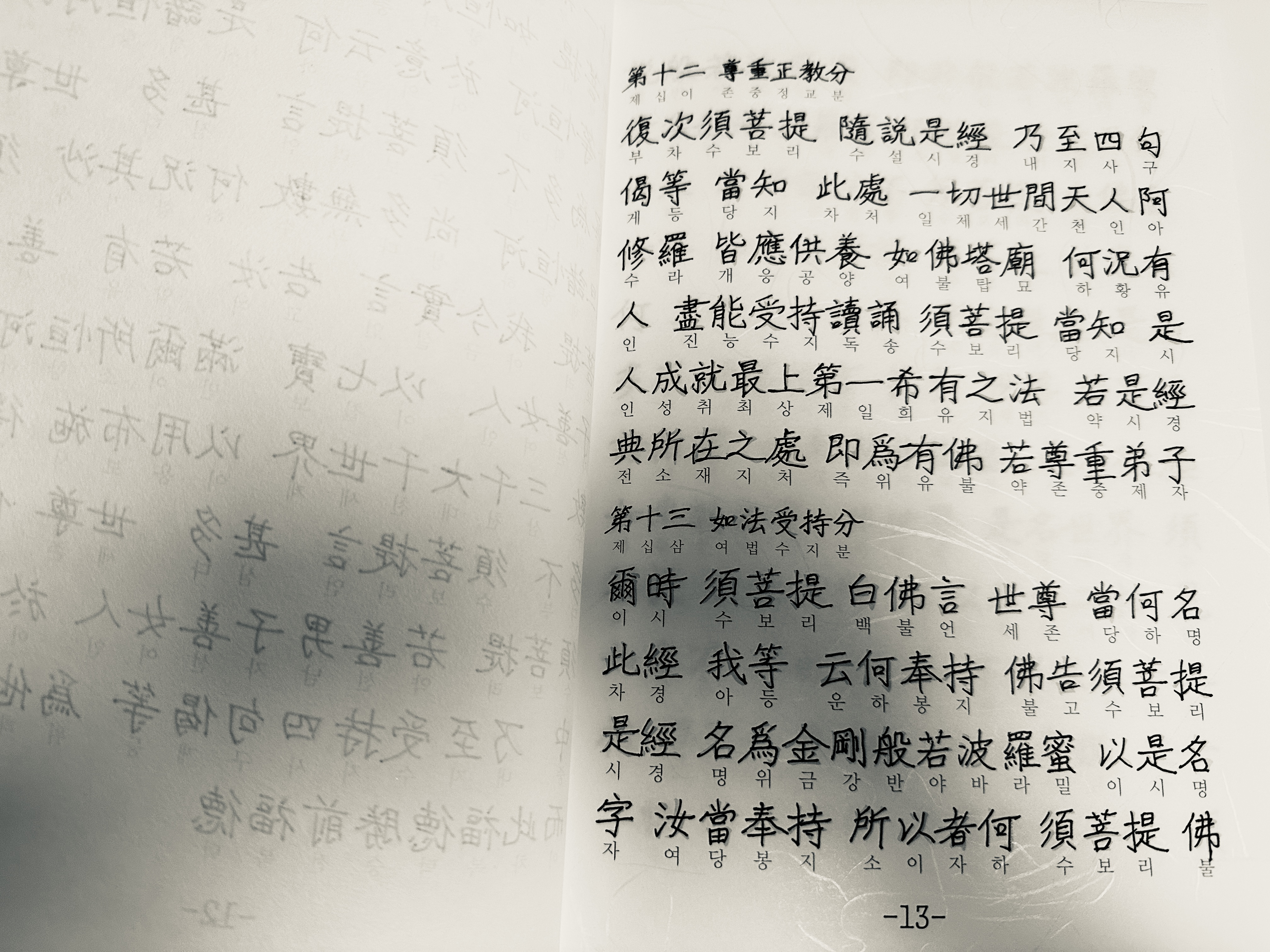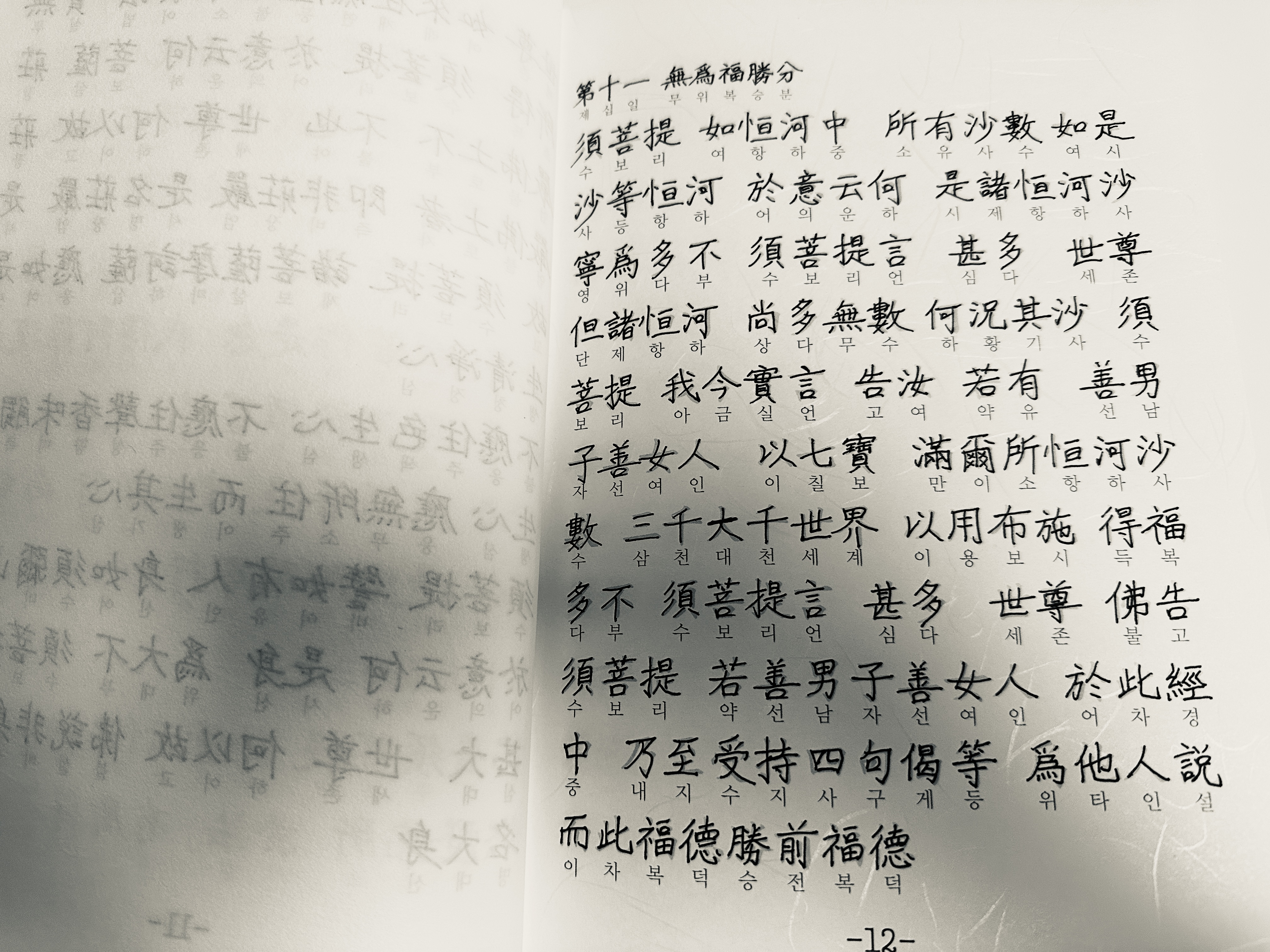 오늘은 금강경 제11장 무위복승분, 제12장 존중정교분, 제13장 여법수지분을 필사했다.