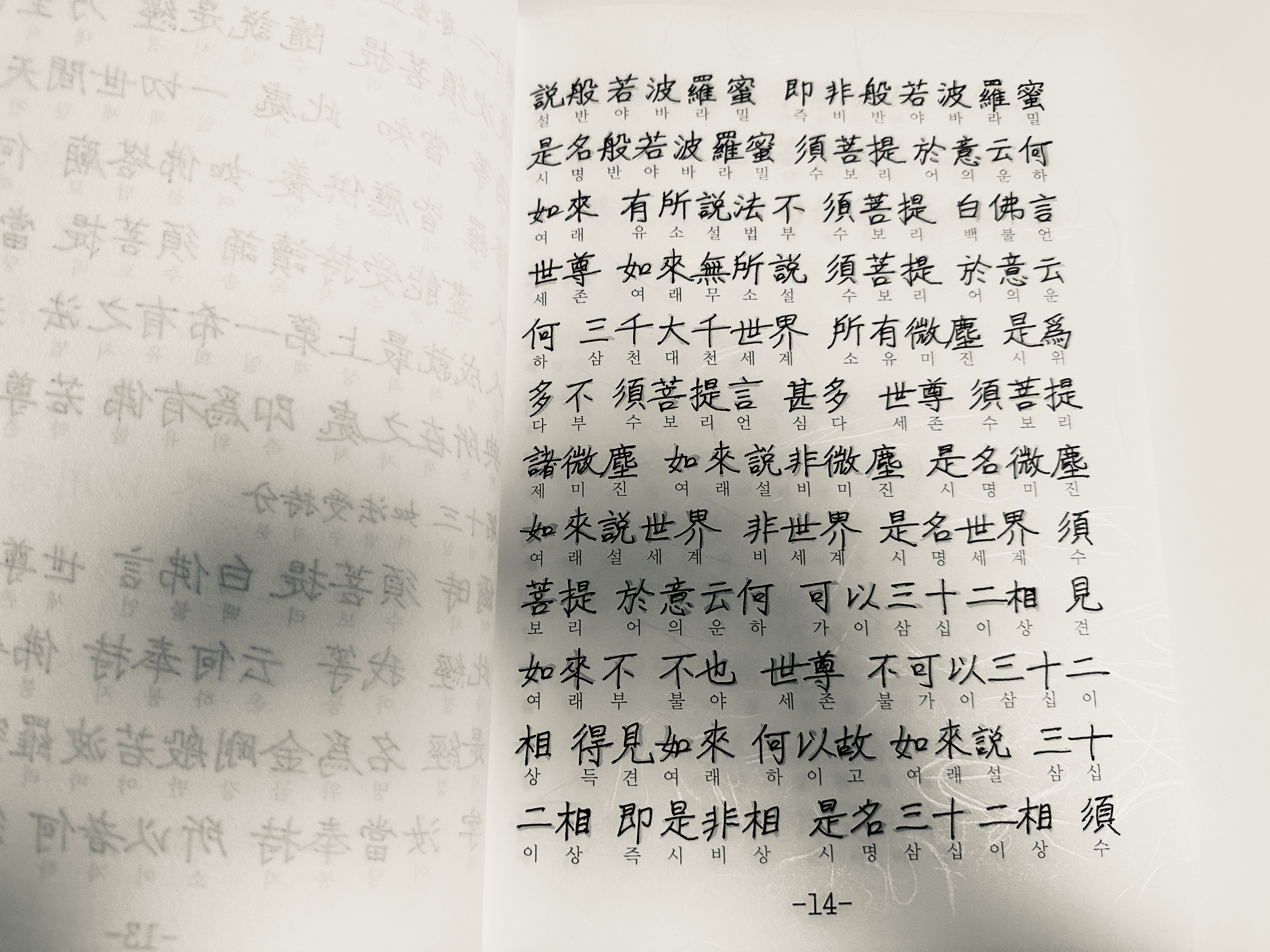 | 24-11-14(목) 금강경 제 14~15장 필사 (0) | 2024.11.14 |