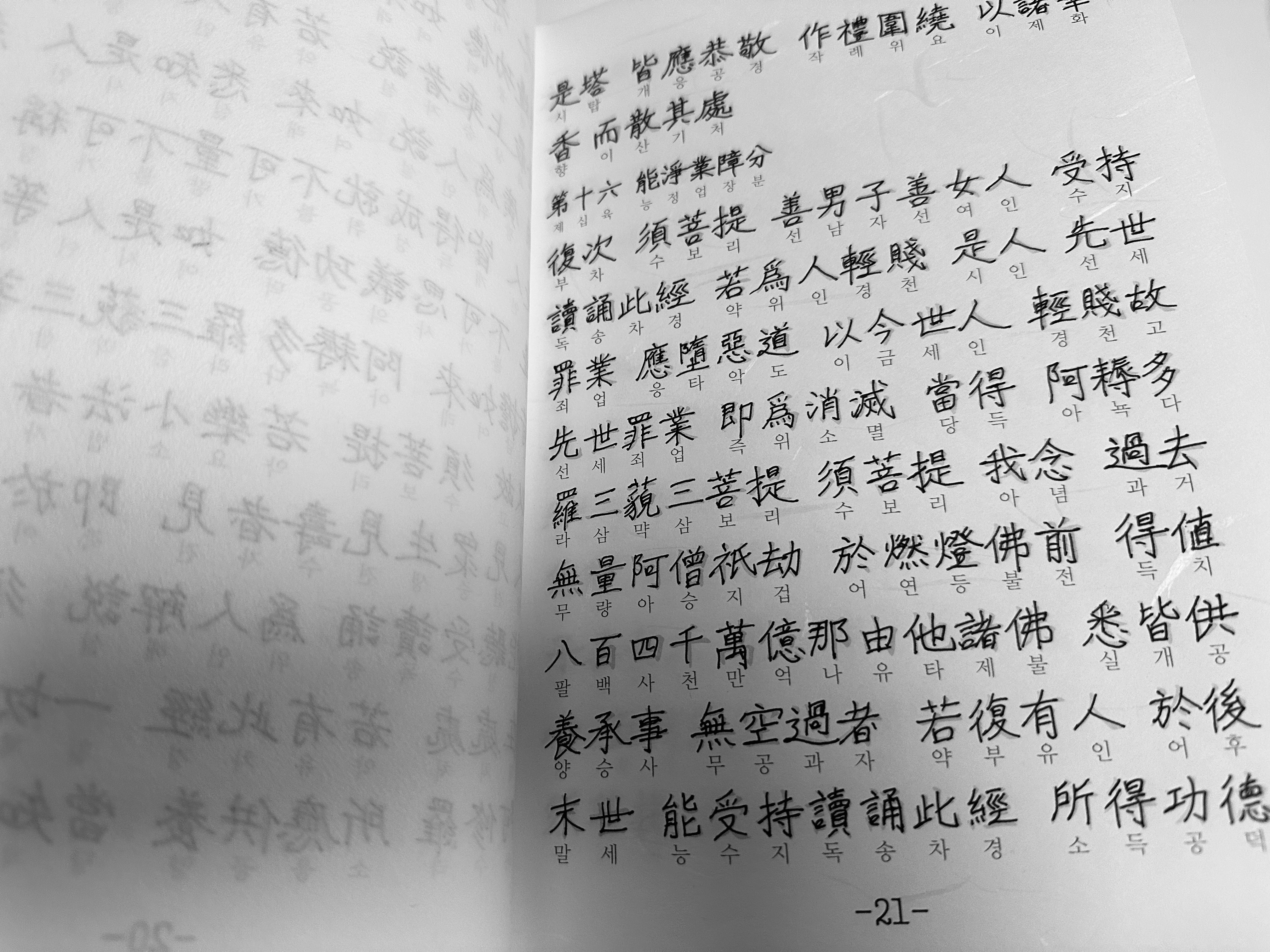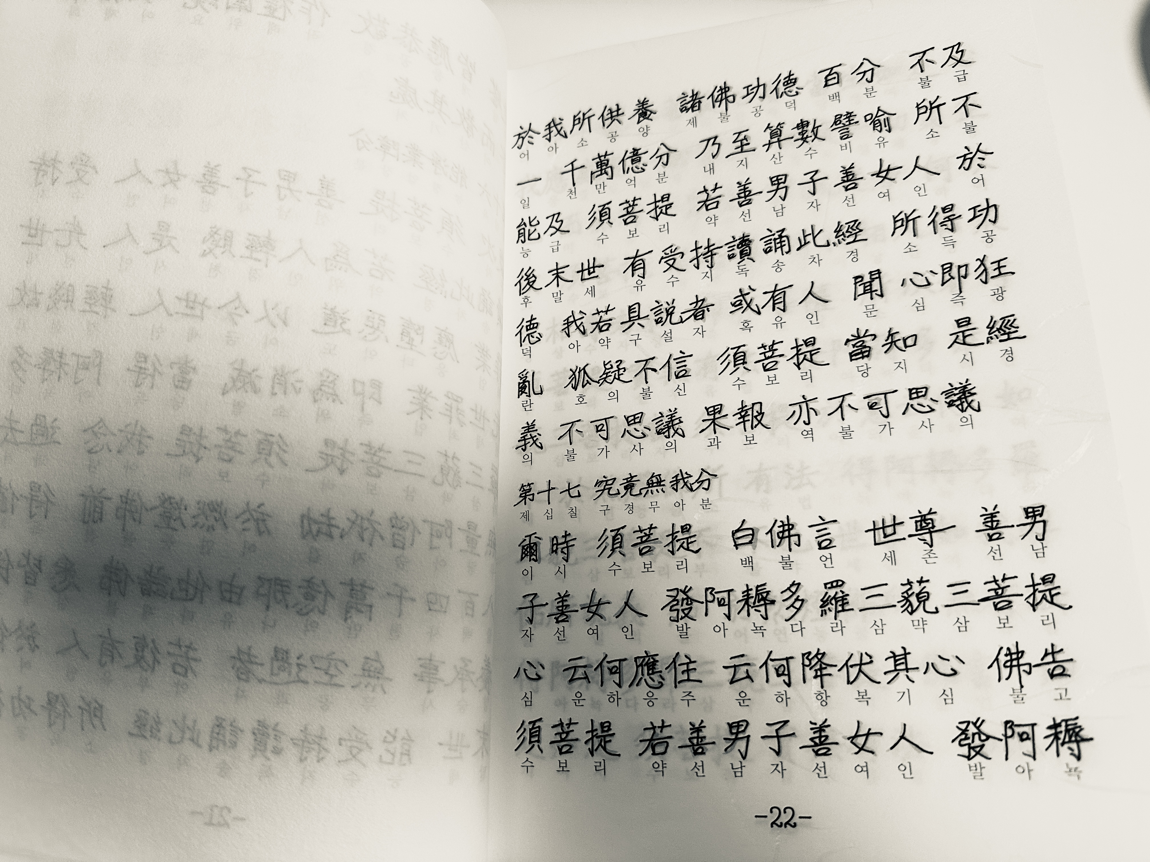오늘은 금강경 제16장 능정업장분과 제17장 구경무아분을 필사했다.